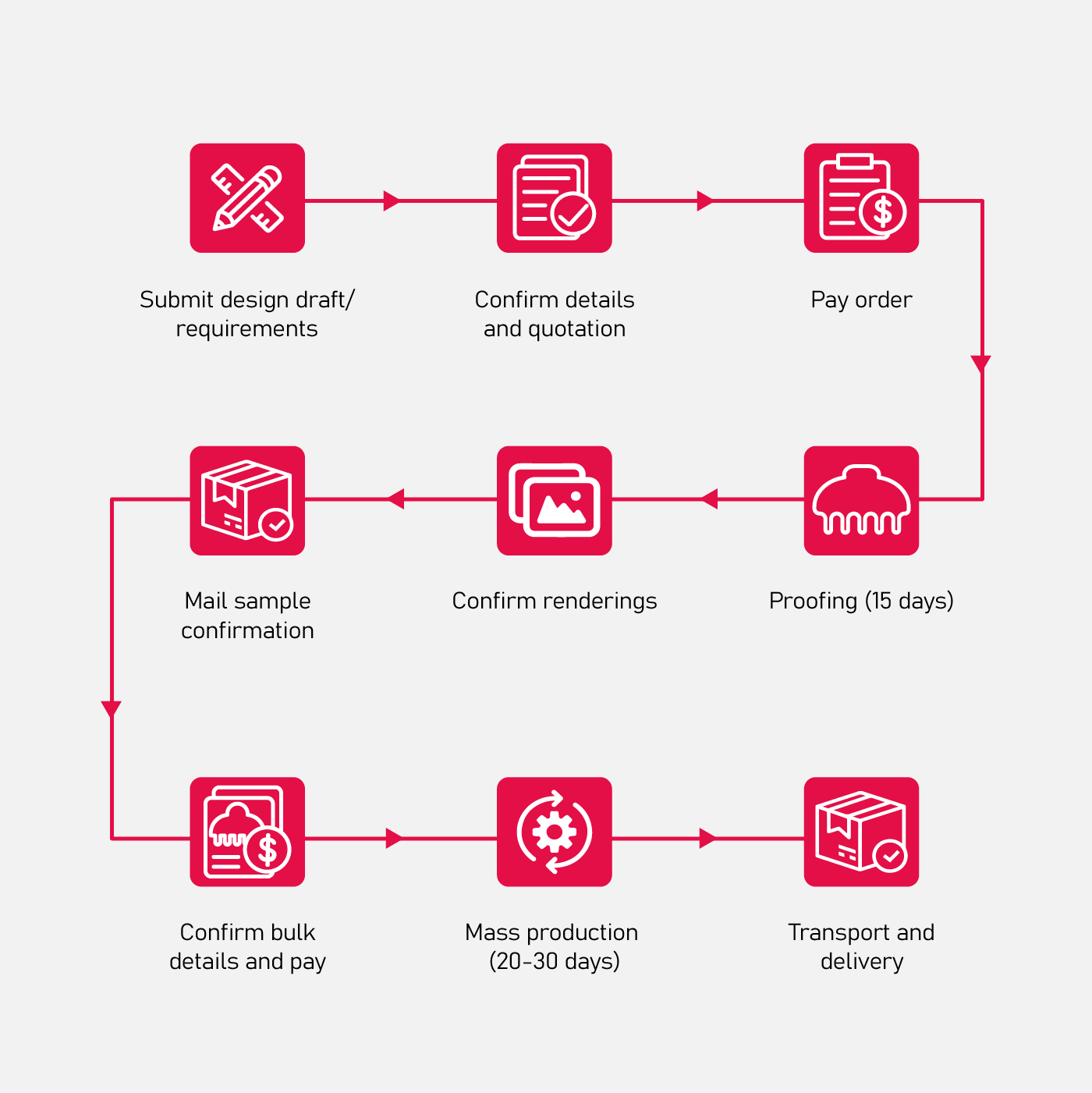 Submit design draft/requirements → Confirm details and quotation → Pay order → Confirm renderings → Proofing (15-30 days) → Mail sample confirmation → Confirm bulk details and pay → Mass production (20-60 days) → Transport and delivery