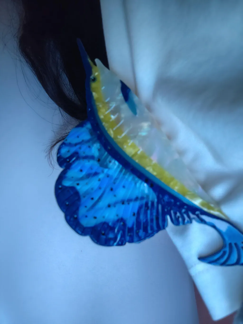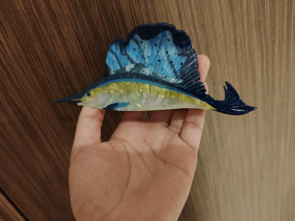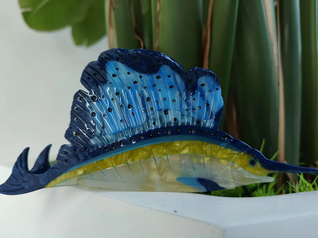 Inspired by the dynamic silhouette and pointed tip of the distinctive Atlantic sailfish and as their magnificent and enormous dorsal fins make them stand out among other marine creatures,  this hair claw will sure to make every user to stand out like a sailfish, shining brightly in the crowd. While respecting their original features, we've paired vibrant azure and sapphire blue colors to add a touch of glamour.